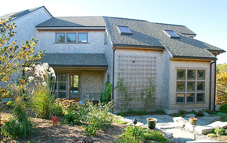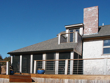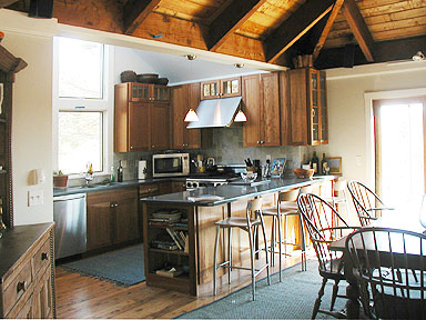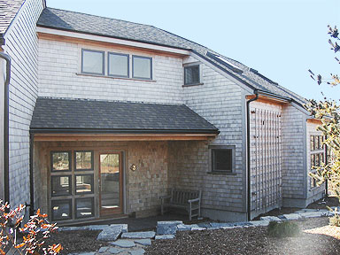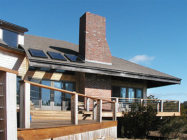This house had a great location and a beautiful view but its dark spaces gave it the character of a hunting camp, rather than a seaside home, and it was much too small for the needs of the new owners. New design and construction including large windows and high ceilings opened the space to the light and the sweeping valley view. Expanded space created areas of privacy for both owners and guests. The large, open living room, and a wide deck surrounding the east and south sides extend into a screened porch and a sunroom creating a circular pattern of movement from outside to inside that makes this home a wonderful place for entertaining. Light falling on beautiful wood floors and a graduated custom stone entryway welcome the many friends of this family.