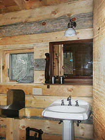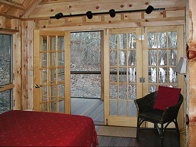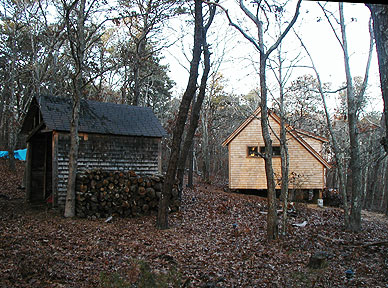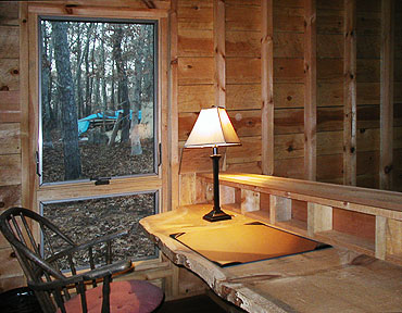 This unique rough-sawn lumber cabin fits naturally into the wooded site in the Cape Cod National Seashore. Details include a built-in desk made of a tree slab and interior plank doors with hand carved knobs. The addition of a screened porch with a four door wide opening that hinges accordion style expands the summer living space into the forest environment.