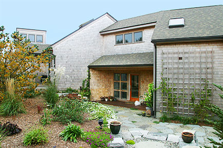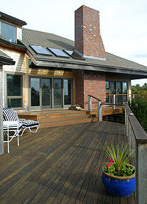 This house had a great location and a beautiful view but its dark spaces gave it the character of a hunting camp, rather than a seaside home, and it was much too small for the needs of the new owners. New design and construction including large windows and high ceilings opened the space to the light and the sweeping valley view. Expanded space created areas of privacy for both owners and guests. The large, open living room, and a wide deck surrounding the east and south sides extend into a screened porch and a sunroom creating a circular pattern of movement from outside to inside that makes this home a wonderful place for entertaining. Light falling on beautiful wood floors and a graduated custom stone entryway welcome the many friends of this family.