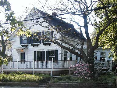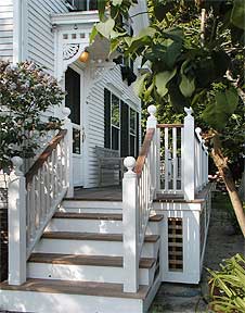 This project called for a banistered porch wrapping around the front and side of a circa 1850 guest house in the East End gallery district in Provincetown. The owners wanted to enhance the privacy of the porches, while maintaining a welcoming external means of entry for their guest rooms, and to extend the social space into the front and side gardens, all in keeping with the setting and the original Greek Revival style of the house.