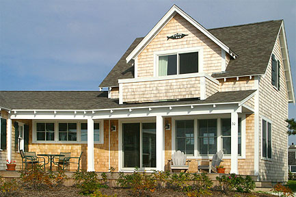The enlargement of this cozy cottage was designed to keep the small scale so the addition doesn’t overpower the existing structure. At the same time, the clients wished to gain private space, as the original house sat exposed on the top of a bare knoll. The new addition was snuggled to the old, wrapping back on itself and creating a covered porch. The old style open eave trim gives an antique look to the addition.